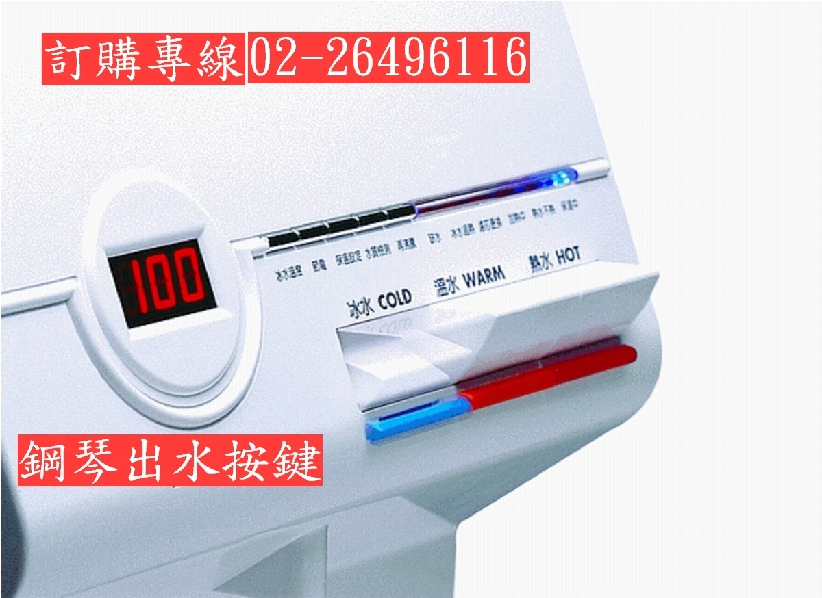 產品特色 _ 冰水,溫水,熱水三用 _ 典雅造型、高貴美觀,適合家庭、醫院、辦公室等場所使用 _ 水質檢測功能 _ 故障、停電、缺水時有斷電及斷水功能 _ 熱水系統採開放式無壓力設計,不會因水源壓力或加熱時產生高壓,導致熱缸易破裂或爆炸之危險 _ 熱水鎖定功能,避免誤觸 微電腦功能 _ 再 沸 騰:隨時喝到100℃開水 _ 水 溫 顯 示:LED數字顯示冰、熱水溫度,解析度1℃ _ 電子式溫度控制 _ 異常碼:機器故障顯示異常碼 _ 水質檢測鍵:輕按此鍵,可檢測水中之T.D.S質 _ 保溫設定:98、95、90多段設定 _ 節能設計:睡眠及週休二日節電及預約開機功能 鋼琴出水按鍵 微電腦功能 _ 再 沸 騰:隨時喝到100℃開水 _ 水 溫 顯 示:LED數字顯示冰、熱水溫度,解析度1℃ _ 電子式溫度控制 _ 異常碼:機器故障顯示異常碼 _ 水質檢測鍵:輕按此鍵,可檢測水中之T.D.S質 _ 保溫設定:98、95、90多段設定 _ 節能設計:睡眠及週休二日節電及預約開機功能 鋼琴出水按鍵 基本規格 _ 電壓:110V/60Hz _ 容量:熱水3.5公升,溫水2公升,冰水1.1公升_ 出水量:(依CNS標準測試)熱水8.5公升/小時,冰水3公升/小時 _ 消耗電功率:熱水750W,冰水130W _ 外觀尺寸: 寬320mm * 深480mm*高520mm _ 本機不含濾芯,建議搭配本公司過濾設備;詳細請參考濾材配件